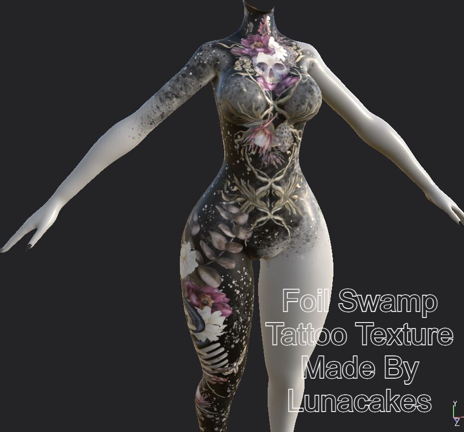 Fits Pandaabears Heel Foot Base. (Pandaabear#9873 Get the base here: https://pandaabear.gumroad.com/l/pAxQR ) TATTOOS ONLY (base/avi not included), base doesn't come with this, you have to lay this on top of a clean skin texture in a photo editor. You will have to have knowledge with a photo editor to use this, as well as unity knowledge. I've already made a convenient unity package for this one all you have to do it lay the tattoo texture over the skin texture in a photo editor and then plug that into the main texture of the provided material.