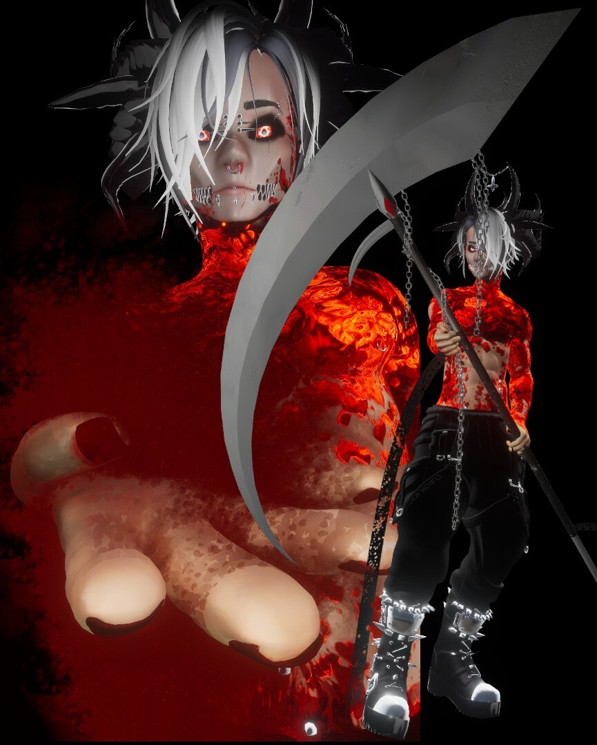 Extras: Scythe that can be held in hand or used as a dancing pole. Outfit Material Swap- Black Matte to Bloodbag Dissolve. Shoe Swap and Hair Swap on Bunny. 3 Ponytail Options On Vance. Piercing Options on Vance. Optional Blood Clone Version in package that requires goo shader. (check credits)